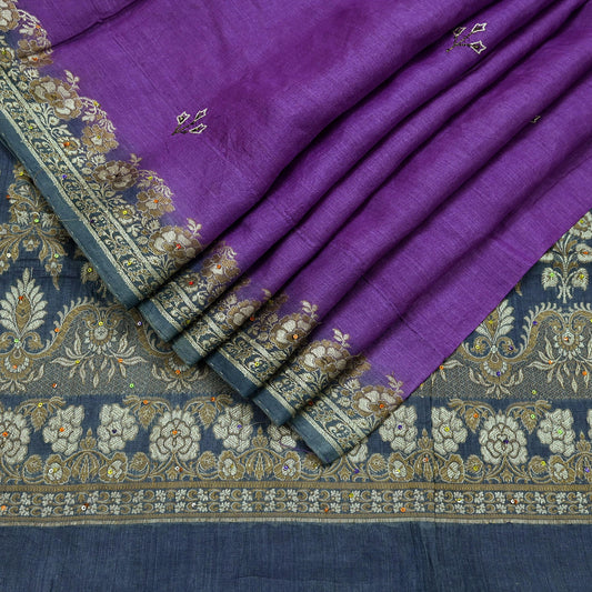 Indian Vintage Sari Purple & Gray Pure Tussar Silk Hand Woven Sarees Craft Fabric 5Yd Sewing Ethnic Dress making Quilting Crafting Upcycle