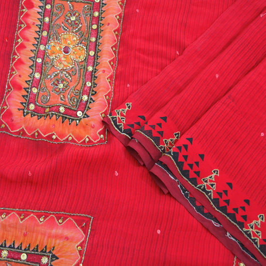 Indian Vintage Sari Red Pure Crepe Silk Hand Embroidered Sarees 5yd Sewing Craft Fabric Dress Making Floral Sequins Upcycle Quilting