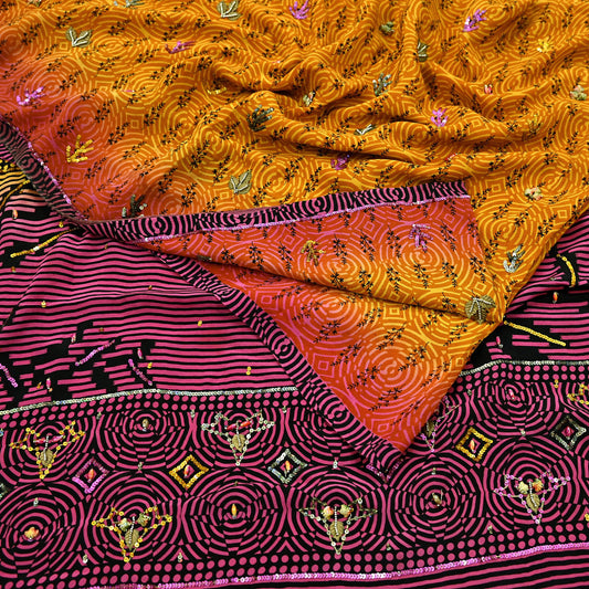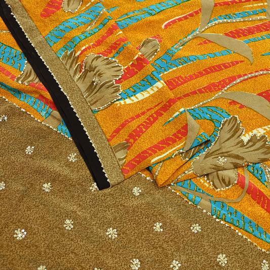 Indian Vintage Sari Saffron & Brown Pure Crepe Silk Hand Embroidered Sarees 5yd Sewing Floral Craft Sequins Dress making Crafting Quilting