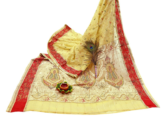 Indian Vintage Sari Yellow Mysore Silk Woven Painted Sarees Fabric 5Yd Ethnic Dress Making Crafting Upcycle Quilting Zari Border