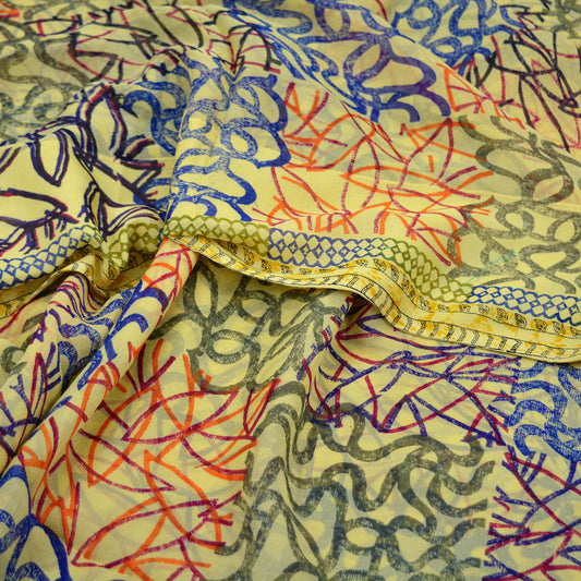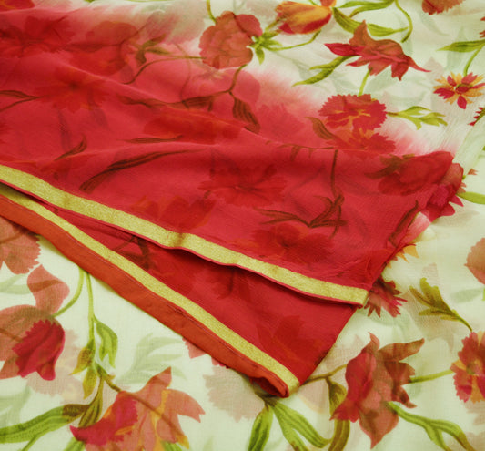 Vintage Sari Yellow & Red Blend Chiffon Printed Saree Sewing 5yd Craft Soft Dress Designing for Crafting Floral Dress Making