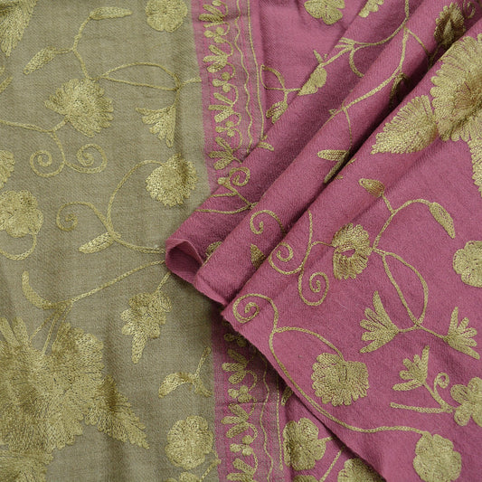 Vintage Shawl Beige & Pink Woolen Shawl Handmade Embroidered Long Throw Stole Warm Floral Design Fringes Soft Cozy For Women's For Winter