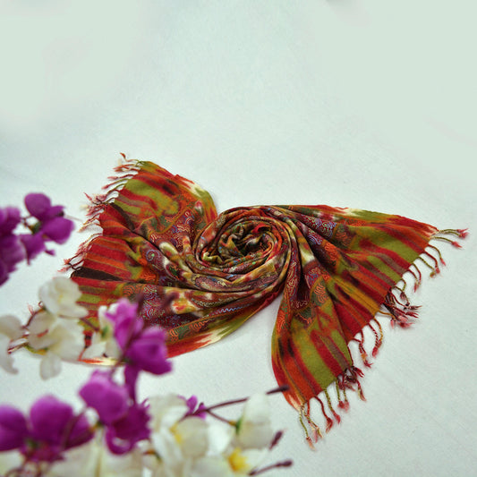 Vintage Stole Red Viscose Handmade Ari work Long Throw Warm Stole Floral Design Fringes