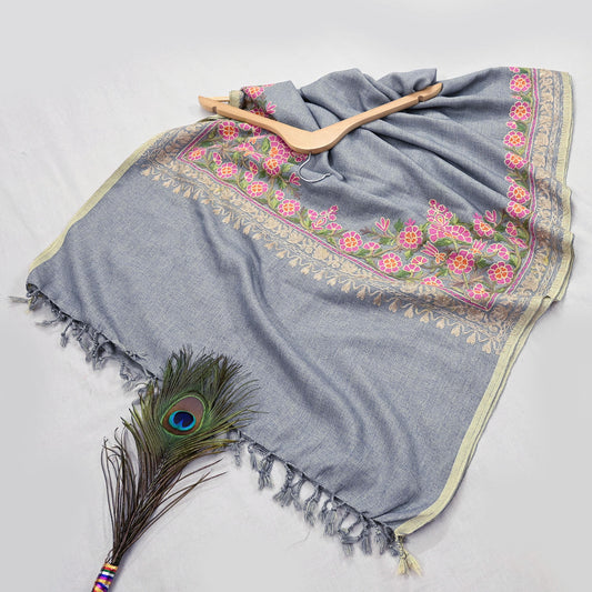 Vintage Shawl Gray Woolen Shawl Handmade Embroidered Long Throw Stole Warm Floral Design Fringes Soft Cozy For Women's For Winter