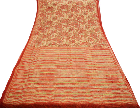 Women Vintage Sari Beige & red Pure Georgette Silk Block Printed Saree Craft Fabric Sewing 5Yd Soft Dress Making Quilting Crafting Upcycle