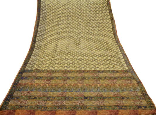 Women Vintage Sari Beige Pure Chiffon Silk Printed Sarees Craft Fabric Sewing 5Yd Soft Dress Making Floral Crafting Quilting Upcycle Used