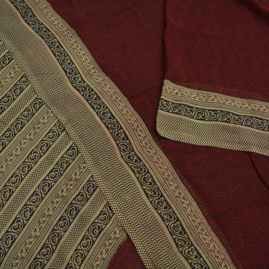 Women Vintage Sari Beige & Maroon Pure Georgette Silk Printed Saree Craft Fabric Sewing 5Yard Soft Light Dress Making Floral Zari