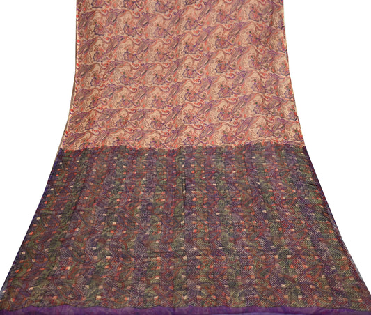 Women Vintage Sari Beige & Purple Pure Chiffon Silk Printed Saree Craft Fabric Sewing 6Yd Soft Light Sari Dress Making Floral
