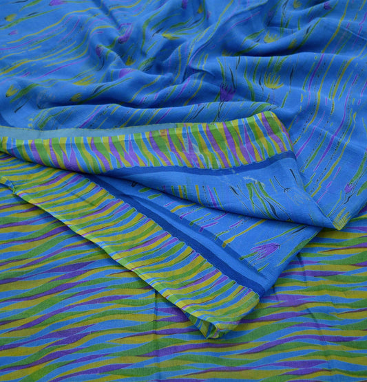 Women Vintage Sari Blue Pure Chiffon Silk Printed Sarees 5Yd Craft Fabric Sewing Soft Light Sari Dress Making Upcycle Quilting Crafting Used