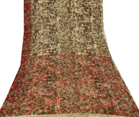 Women Vintage Sari Beige Pure Chiffon Silk Printed Sarees Craft Fabric Sewing 5Yd Soft Dress Making Floral Crafting Quilting Upcycle Used