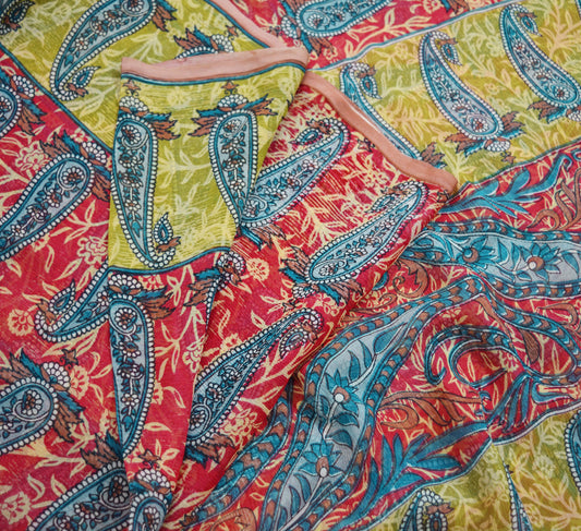 Women Vintage Sari Green & Red Pure Chiffon Silk Printed Saree Craft Fabric Sewing 5Yd Soft Light Sari Dress Making Floral