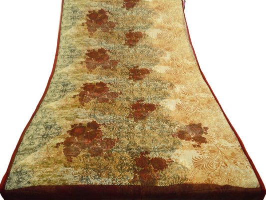 Women Vintage Sari Ivory & Brown Pure Georgette Silk Printed Saree Craft Fabric Sewing 5Yard Soft Light Dress Making Floral