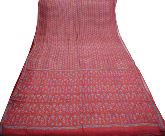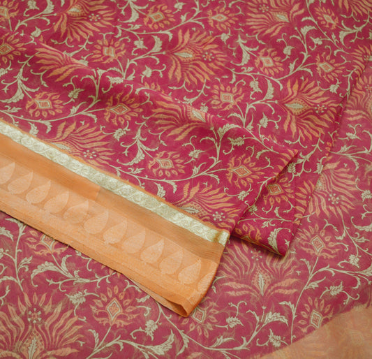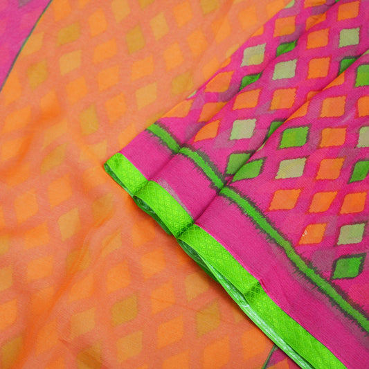 Women Vintage Sari Orange & Pink Pure Chiffon Silk Printed Saree Craft Fabric Sewing 6Yard Soft Light Sari Dress Making