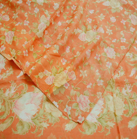 Women Vintage Sari Orange Pure Chiffon Silk Printed Saree Craft Fabric Sewing 5Yard Soft Light Sari Dress Making Floral