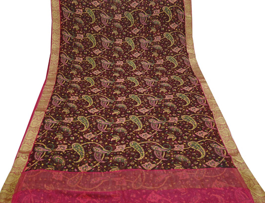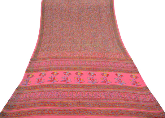 Women Vintage Sari Pink & Brown Pure Chiffon Silk Printed Sarees Craft Fabric Sewing 5Yd Soft Dress Making Crafting Quilting Upcycle Used