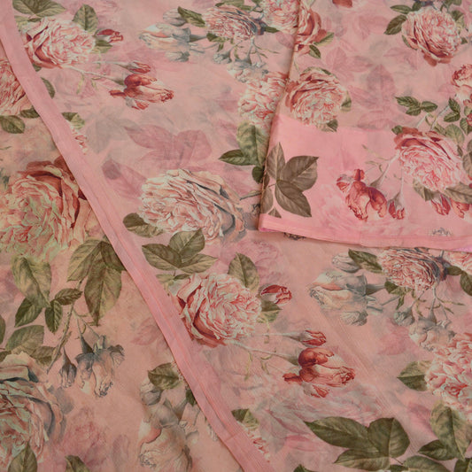 Women Vintage Sari Peach Pure Chiffon Silk Digital Printed Sarees Craft Fabric Sewing 5Yd Soft Light Sari Dress Making Floral