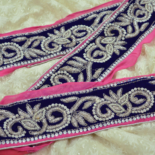 Indian Vintage Blue & Pink Sari Border Hand Embroidered Craft Trim Lace Sewing Sari Ribbon Velvet