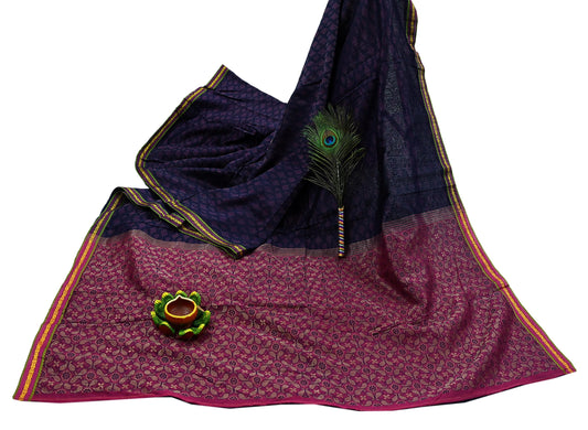Indian Vintage Blue Dupatta Long Stole Block Print Pure Chanderi Silk Scarves Veil Golden Zari Floral Design For her Peacock