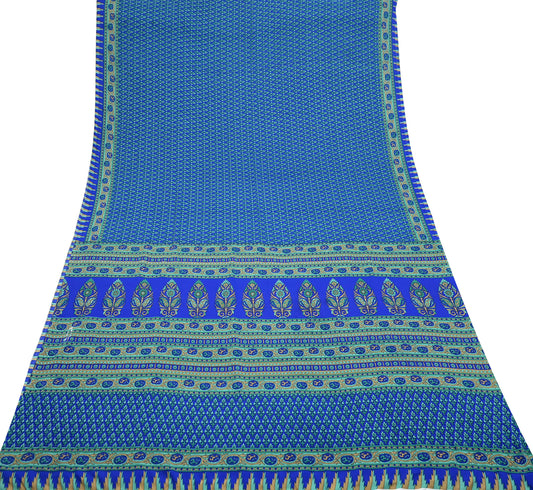 Indian Vintage Blue & Green Sarees Moss Crepe Printed Sari 5yd Sewing Floral Soft Craft Fabric DressMaking For Crafting Quilting Upcycle