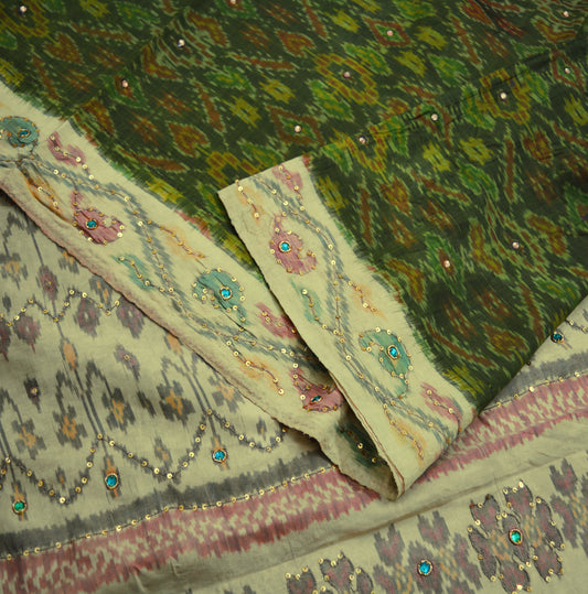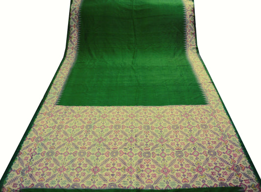 Indian Vintage Green & Cream Pure Silk Saree Hand Embroidered Woven Ikat Patola Indian Sari Fabric 5Yard Craft Ethnic Premium Saree Zari