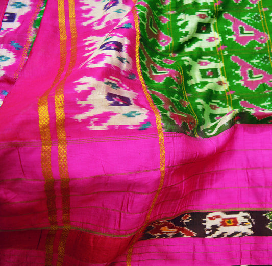 Indian Vintage Green & Pink Saree Pure Silk Patan Patola Hand Woven Ikat Indian Sari Fabric 5Yard Craft Ethnic Zari Border Elephant