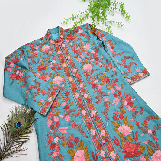 Indian Vintage Green Embroidered Kashmiri Coat, Aari Embroidery, Raw Silk Coat, Boho Jacket For Both Women/Men Indian Coat