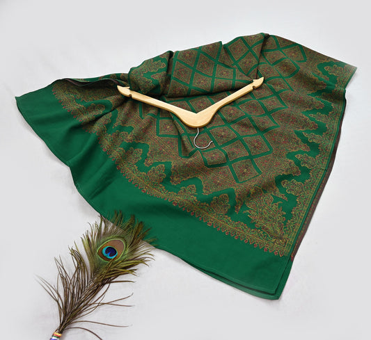 Indian Vintage Green Pure Woolen Shawl Handmade Woven Work Long Throw Stole Warm Paisley Design Soft