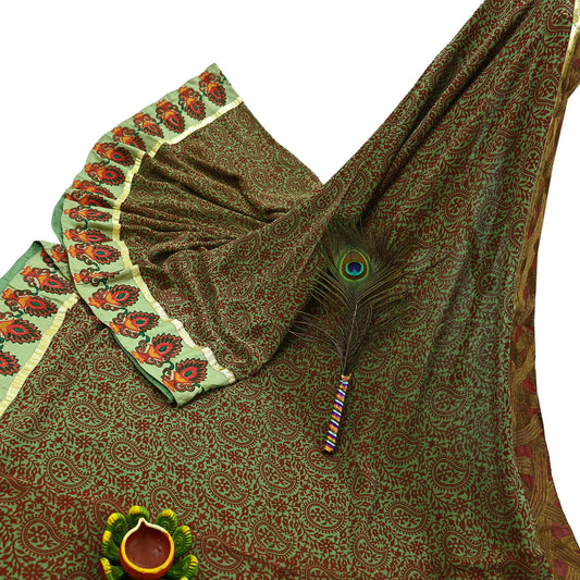 Indian Vintage Green Saree Pure Satin Silk Premium Printed Sari Craft Fabric 5yd Sewing Abstract Soft Dress Making For Crafting Quilting