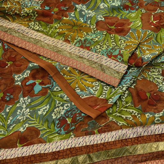 Indian Vintage Green Saree Pure Georgette Silk Hand Embroidered Printed Sari Craft Fabric Sewing 6Yard Soft Light Dress Making Floral