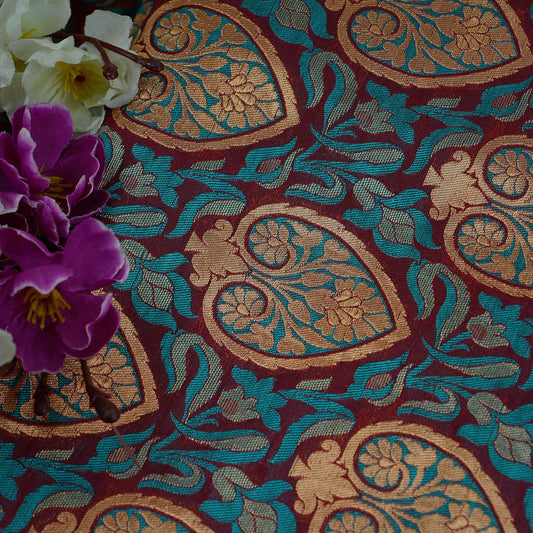 Indian Maroon Color Artificial Silk Woven Brocade Banarasi Zari Work Design Fabric Used in Different Designing in Multi Apparels.