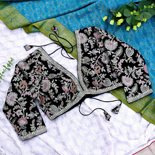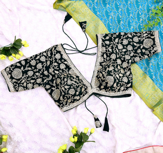 Indian New Black Chanderi silk Hand Embroidered Padded Blouse/Top/Crop M Size Party wear Bollywood
