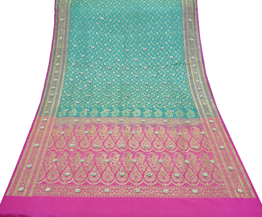 Indian Vintage Heavy Wedding Sari Teal Green Pure Satin Silk Woven Banarasi Tanchoi Sarees 5yd Craft Fabric Sewing Floral Quilting Upcycle