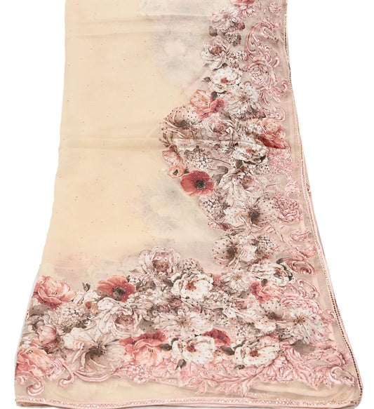 Indian Vintage Ivory Dupatta Pure Organza Silk Long Stole Hand Embroidered Scarves Floral Design Stole Veil Wrap