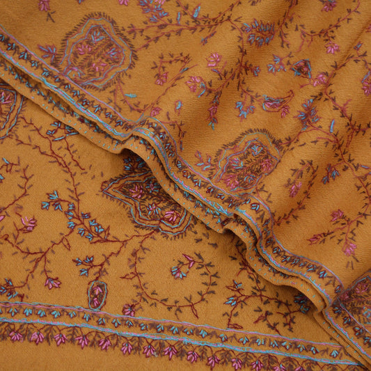 Indian Vintage Mustard Pure Woolen Shawl Handmade Suzani Long Throw Stole Warm Floral Design For Winter For Women's Soft Cozy Scarf Scarves