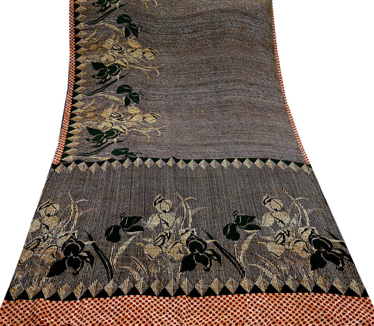 Indian Vintage Orange & Gray Saree Pure Khadi Silk Handloom Printed Indian Sari Fabric 5yard Ethnic Wear Sari Floral