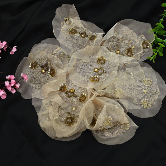 Indian Vintage Peach Net Hand-Embroidered Appliques Set of 5, Zardozi, Dabka, Mukesh, Bead Work | Floral Patches for Crafts, Journals