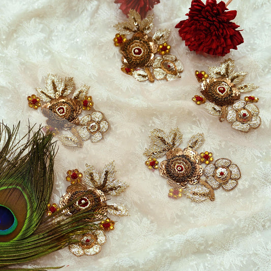 Indian Vintage Peach Net Hand-Embroidered Appliques Set of 5 I Zardozi, Dabka, Bead Work | Floral Patches for Crafts, Journals