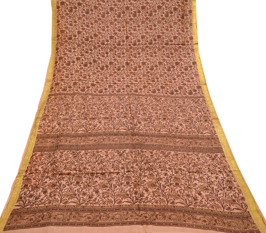Indian Vintage Peach Saree Pure Silk Printed Sari Craft Fabric 5yd Sewing Soft Dress Designing for Crafting Quilting Floral Zari Border