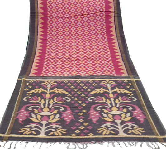 Indian Vintage Pink & Brown Saree Pure Silk Pochampally Hand Woven Ikat Sari Craft Fabric 5Yd Ethnic Zari Border Dress making Fringes