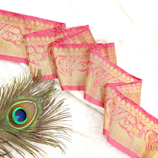 Indian Vintage Pink Banarasi Silk Sari Border Trim 1yd Pure Zari Woven Ribbon Recycled Saree Fabric Lace for Sewing Craft Home Decor