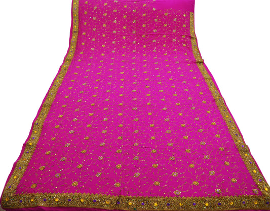 Indian Vintage Pink Saree Pure Silk Hand Embroidered Bandhani Printed Sari Craft Fabric 5yd Soft Zardozi Dress making Quilting Crafting