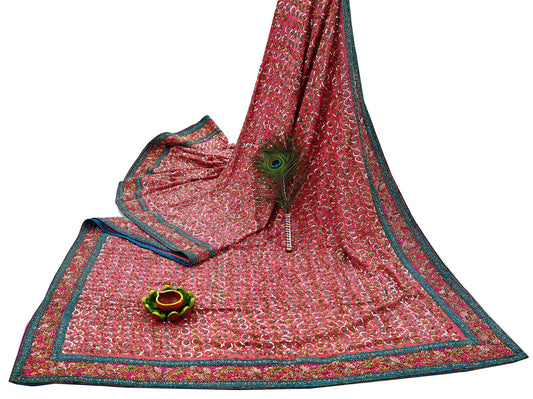Indian Vintage Pink Heavy Green Dupatta Pure Silk Long Stole Hand Embroidered Scarves Sequins