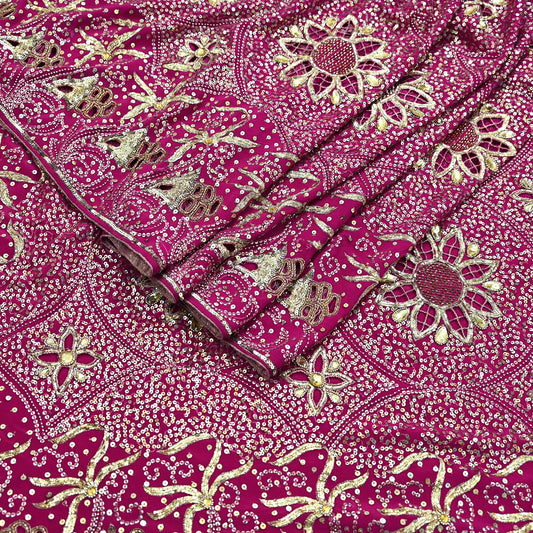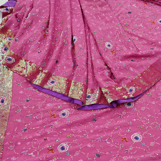Indian Vintage Pink Saree Pure Crepe Silk Hand Embroidered Indian Sari Fabric 5Yd Sewing Soft Zardozi/Dabka Sequins