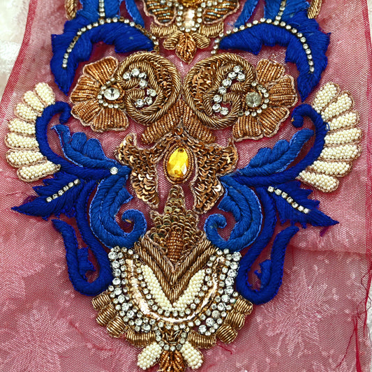 Indian Vintage Pink Net/Mesh Appliques Set of 1 | Hand-Embroidered Floral Patches with Zardozi,Dabka, Zari,for Craft, Journals