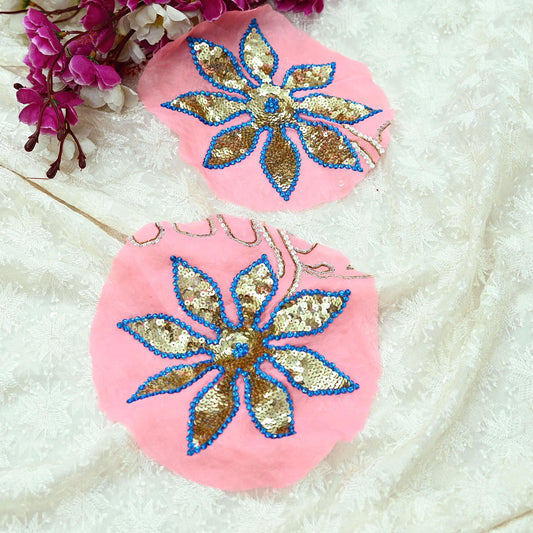 Indian Vintage Pink Pure Georgette Silk Appliques Set of 2 | Hand-Embroidered Floral Patches with Zardozi, Dabka, for Craft, Journals