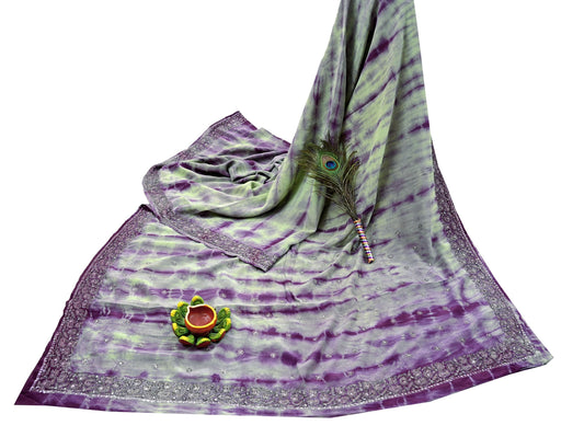Indian Vintage Purple & Green Saree Pure Crepe Silk Hand Embroidered Tie-Dye Sari Fabric 5yard Sewing Craft Fabric Ethnic zari