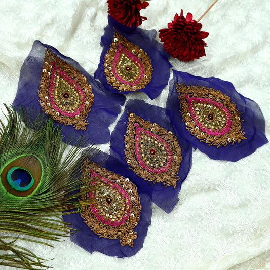 Indian Vintage Purple Pure Georgette Silk Appliques Set of 5 | Hand-Embroidered Floral Patches with Zardozi, Dabka ,for Craft, Journals