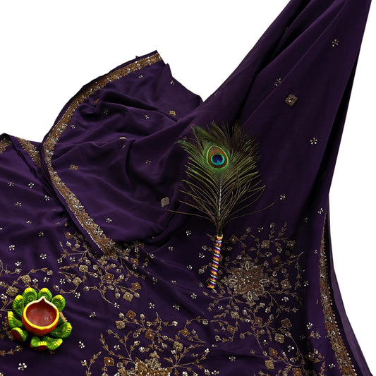 Indian Vintage Purple Saree Pure Georgette Silk Hand Embroidered Indian Sari Fabric 6Yard Sewing Soft Ethnic Zari Fabric