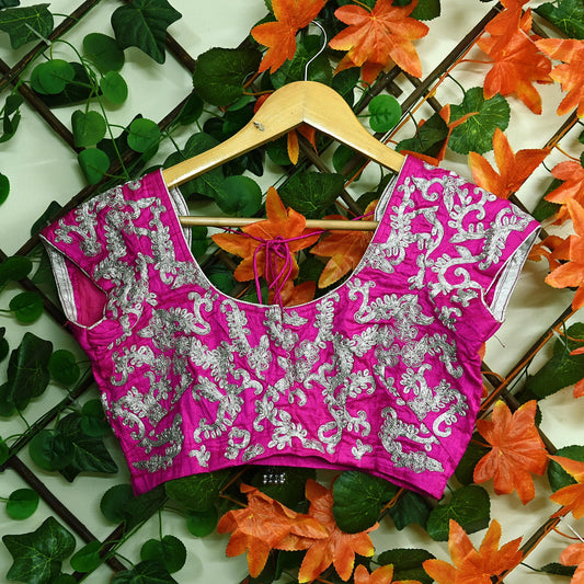 Indian Pre-owned Magenta Pure Chanderi Silk Hand Embroidered By Designer Anamika Khanna Blouse/Top/Crop M Size Party wear Bollywood