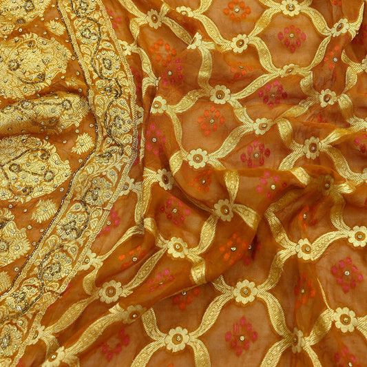 Indian Vintage Saffron & Red Dupatta Pure Georgette Silk Hand Embroidered Bandhani Veil Scarves Soft Sequins Glass Beaded